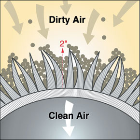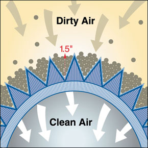 | 短而硬的創(chuàng)新濾材褶裥,大大提高了粉塵捕捉和清灰效率。通過減短濾筒的褶高:從標準的50mm (2英寸) 縮短至38mm (1.5英寸),使褶壁不易折疊或彎曲,令攔截下來的粉塵更易被清出。 |