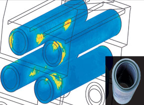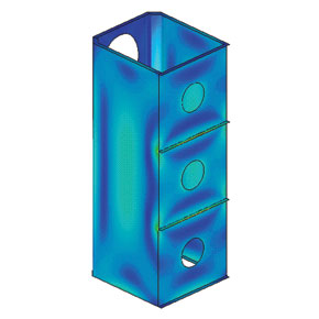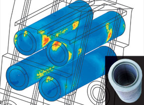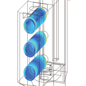 先進的FLUENT軟件模擬流體動力學,結(jié)構(gòu)力學和聲學分別模擬了DFO型號1-1,2-2,3-3的性能等級。而下面(左圖)顯示了利用FLUENT軟件作流量測試,從而令DFO 3-3內(nèi)部的氣流速度更均勻分布。另外下右圖顯示了利用ANSYS®*結(jié)構(gòu)分析軟件測試DFO 3-3,在正常工作壓下之內(nèi)部壓力分布測試。