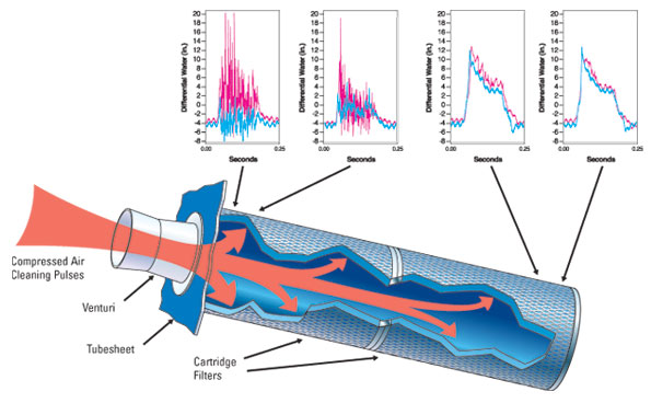 ExtraLife脈沖清灰系統(tǒng)采用專有的模擬脈沖清灰技術(shù)來設(shè)計,令粉塵可以輕松地從濾筒表面吹掉,從而提高過濾效率,延長濾材的使用壽命。圖中紅色曲線顯示ExtraLife系統(tǒng)在DFO前排濾筒產(chǎn)生的壓力增加。而藍色曲線則表示普通濾筒的脈沖反吹表現(xiàn)。