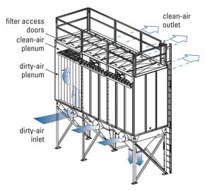 MB除塵器有兩種入口連接選擇:最常用的是塵斗進(jìn)氣口連接,含塵空氣會(huì)先撞在進(jìn)氣口的導(dǎo)流板上,較重的顆粒會(huì)因撞擊直接落入塵斗,因而減少了粉塵量,有效延長(zhǎng)了濾袋使用壽命和減低運(yùn)行壓差。 對(duì)于較輕或纖維性的粉塵,可以選用高位進(jìn)風(fēng)連接來避免除塵器內(nèi)的上升氣流速度影響清灰,令粉塵在脈沖清灰時(shí)可更有效地落入塵斗。